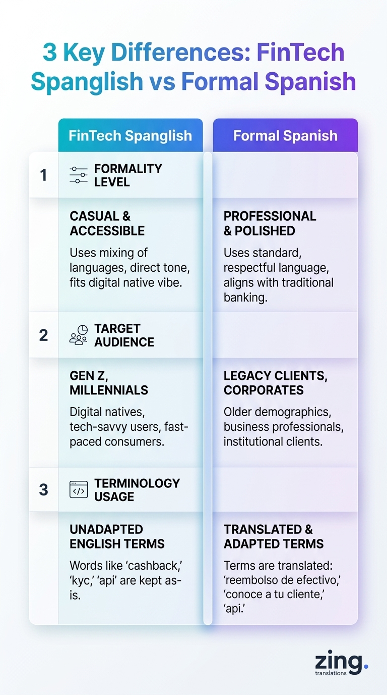 This infographic highlights three key differences between FinTech Spanglish and Formal Spanish. It helps readers navigate terminology in fintech communications.